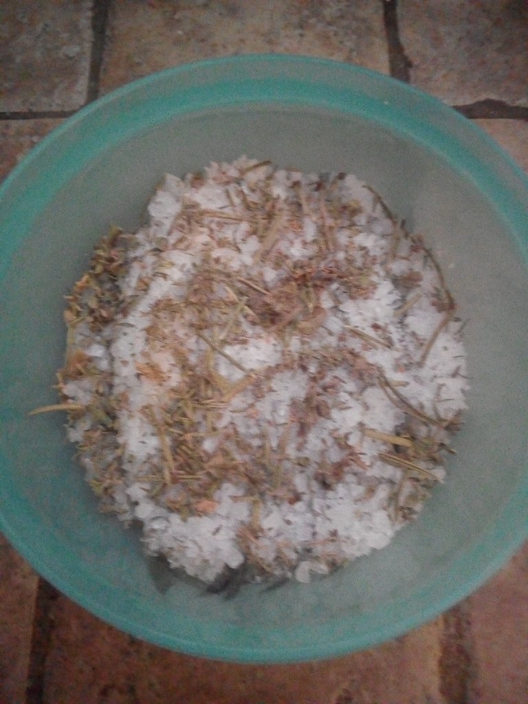 Prima ho messo uno strato di erbe, quelle che avevo in casa. Nel mio caso si tratta di: origano, mentuccia, salvia, prezzemolo, rosmarino e timo.