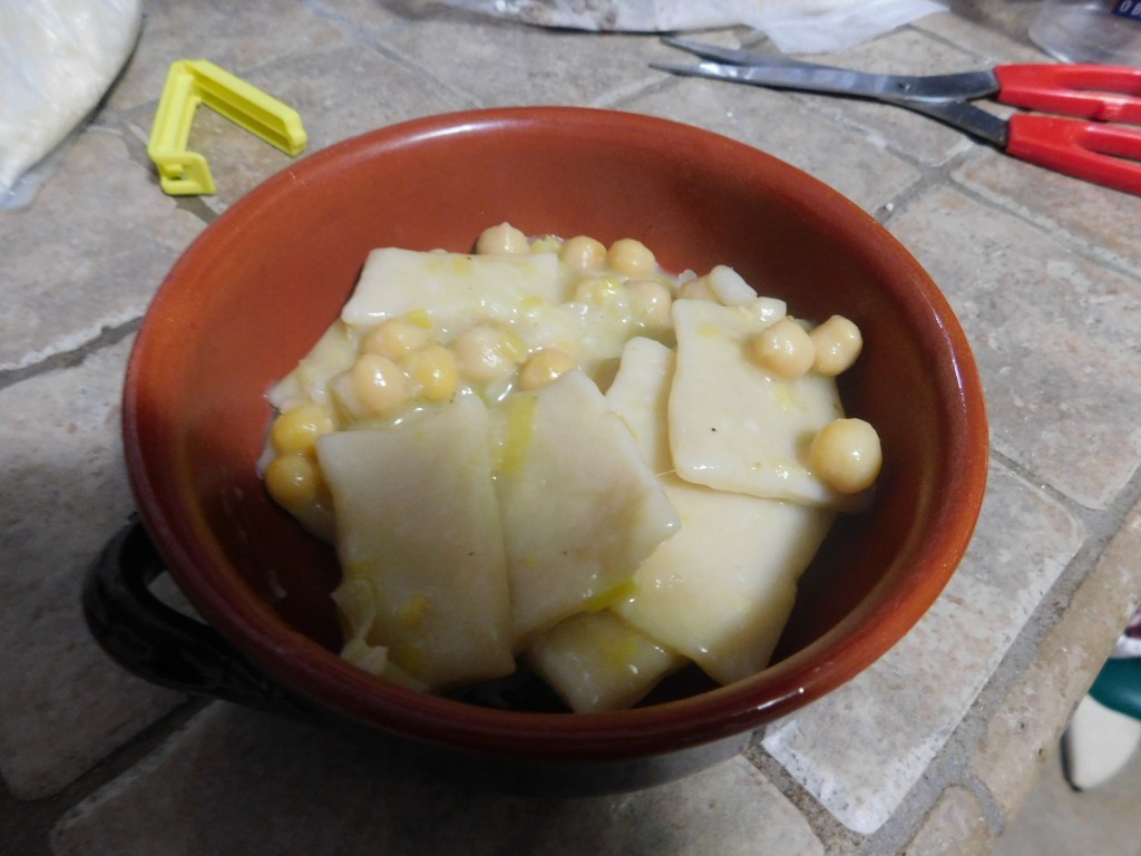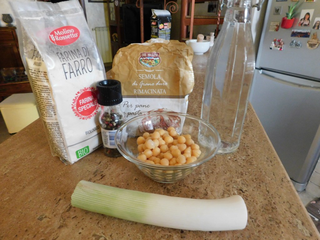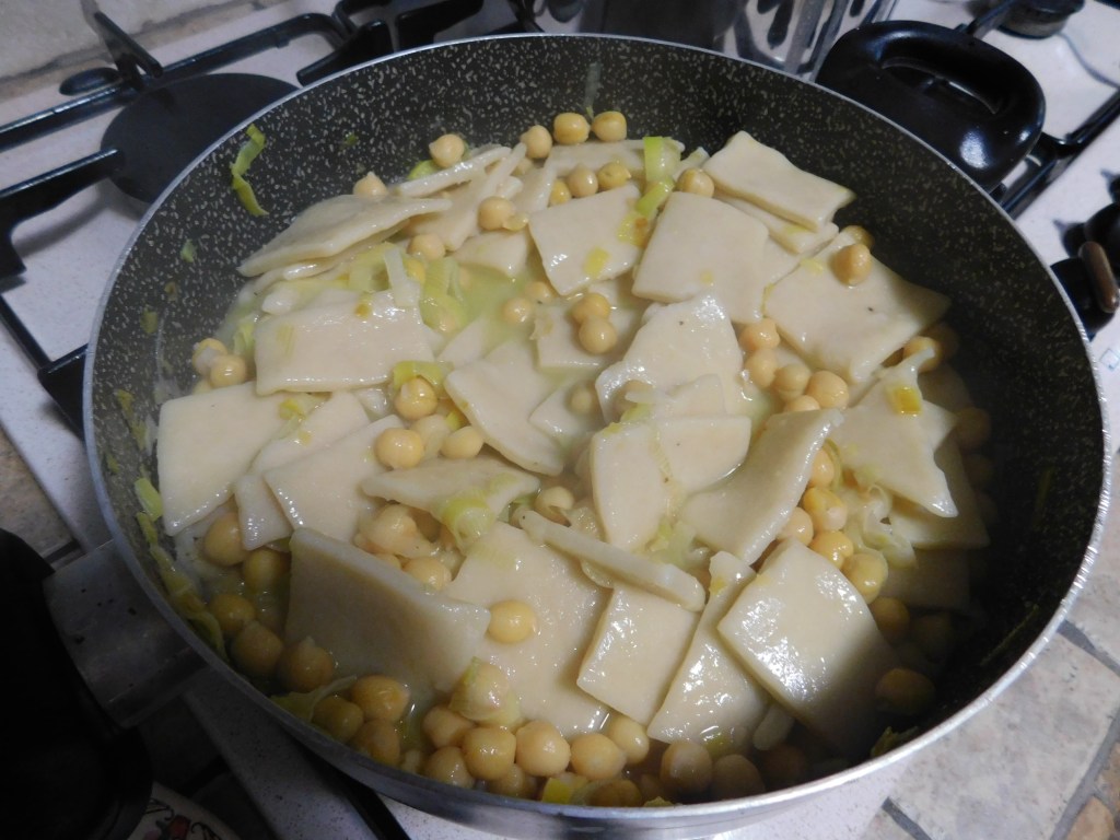 7- Mettiamo a cuocere la pasta nell’acqua dei ceci che abbiamo conservato. Scoliamola quando è ancora un po’ al dente, conservando ancora l’acqua dei ceci.