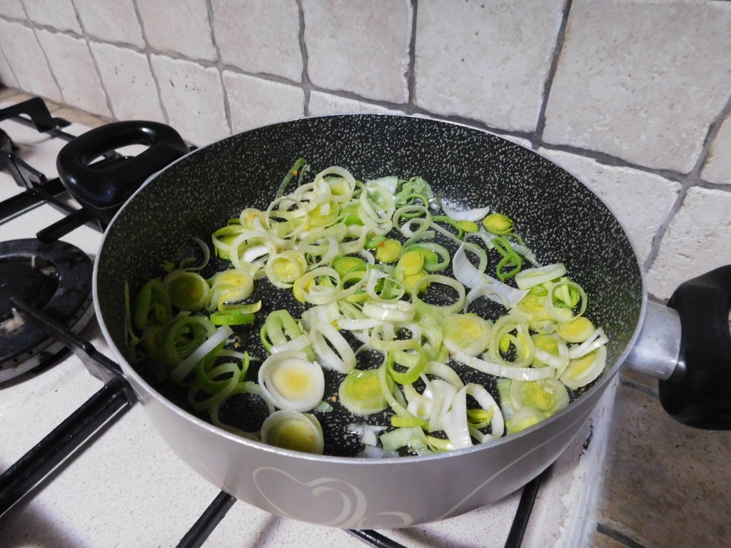 4- Nel frattempo tagliamo a rondelle il porro e cuociamolo in padella con l’olio.
